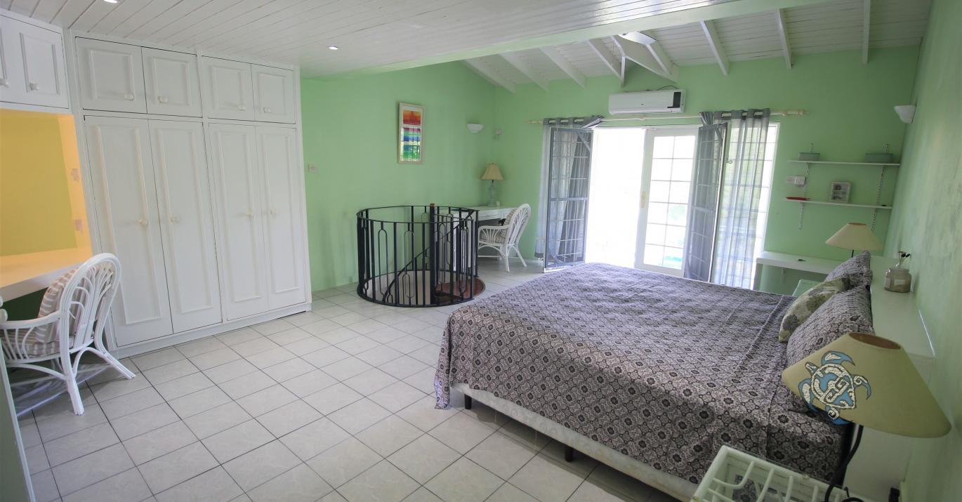A spiral stair case leads you to the first floor which consists of the master suite: