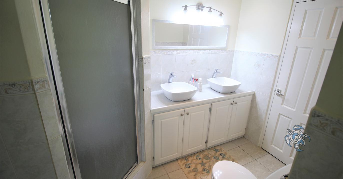 - Full bathroom with shower and single vanity.